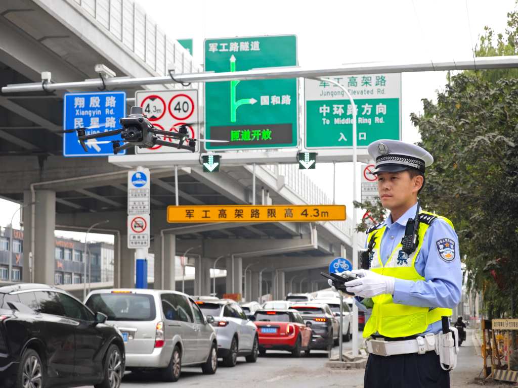 10月13日早晨,倪嘉辉在民星路上闸道操控警用无人机监测车流。